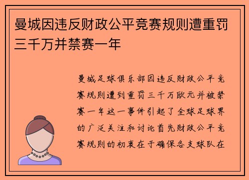 曼城因违反财政公平竞赛规则遭重罚三千万并禁赛一年