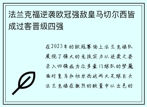 法兰克福逆袭欧冠强敌皇马切尔西皆成过客晋级四强